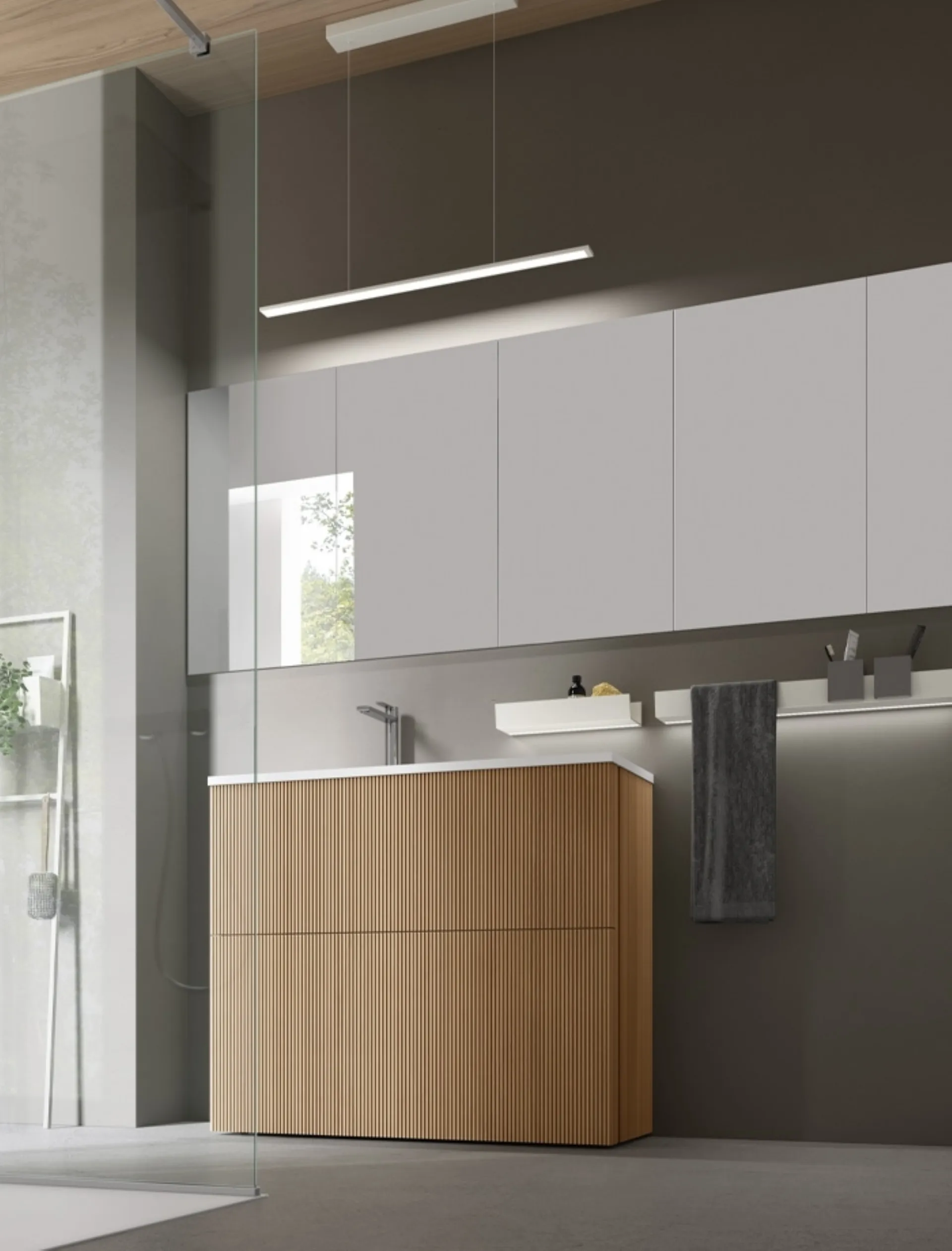 Mobili bagno a terra Wind 05 di Arcom: scopri l'Arredo Bagno in legno design e arreda la stanza del benessere.