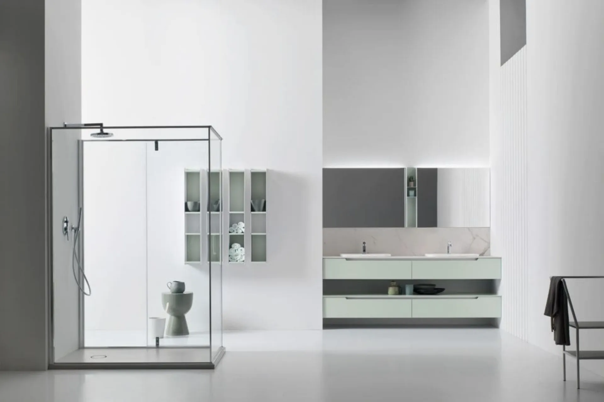 Arreda la stanza del benessere moderno perfettamente con Gold 04, mobili bagno sospesi e accessori in laccato opaco di Arcom.