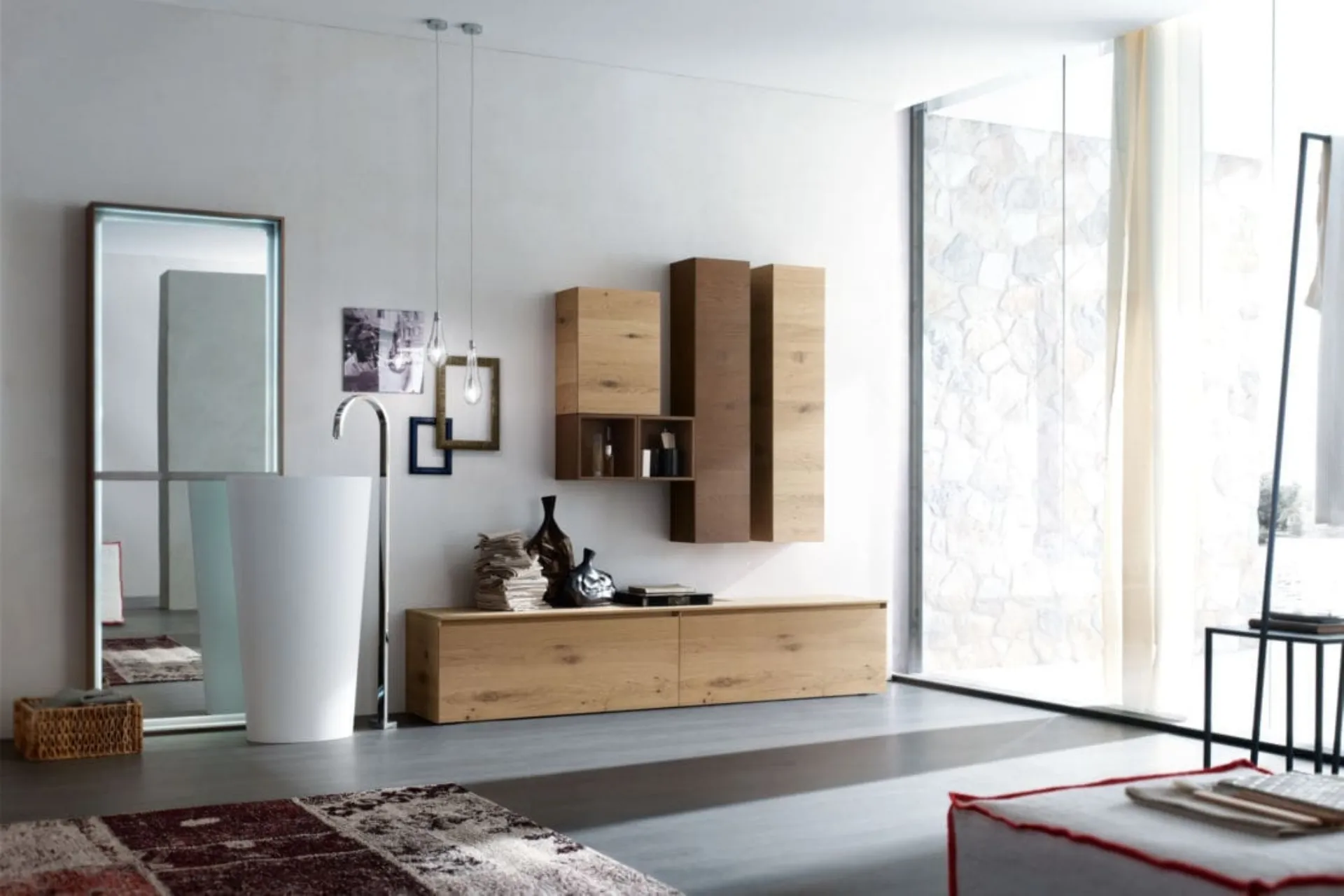 Mobili bagno a terra in legno della marca Arcom: clicca e scopri l'arredo bagno moderno La Fenice 01 per la stanza del benessere.