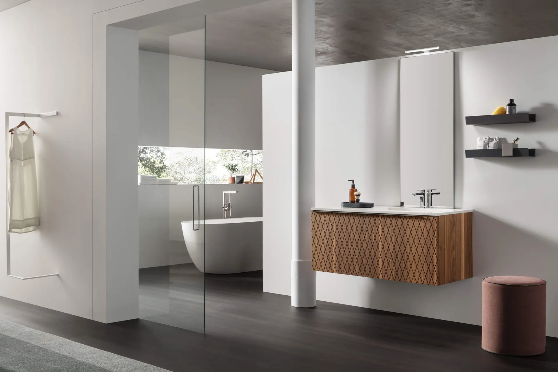 Scopri di più sull'arredo bagno design: mobili bagno sospesi in legno come il modello Pollock Trame 104 di Arcom ti aspettano.