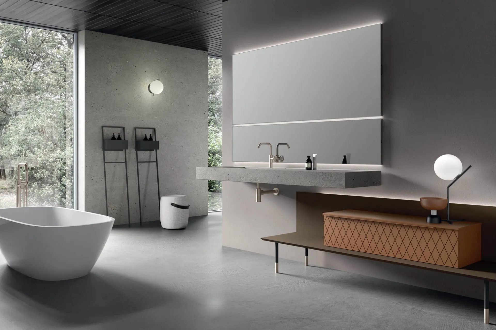 Arreda la stanza del benessere design perfettamente con Rail Line 11, mobili bagno a terra e accessori in laccato opaco di Arcom.