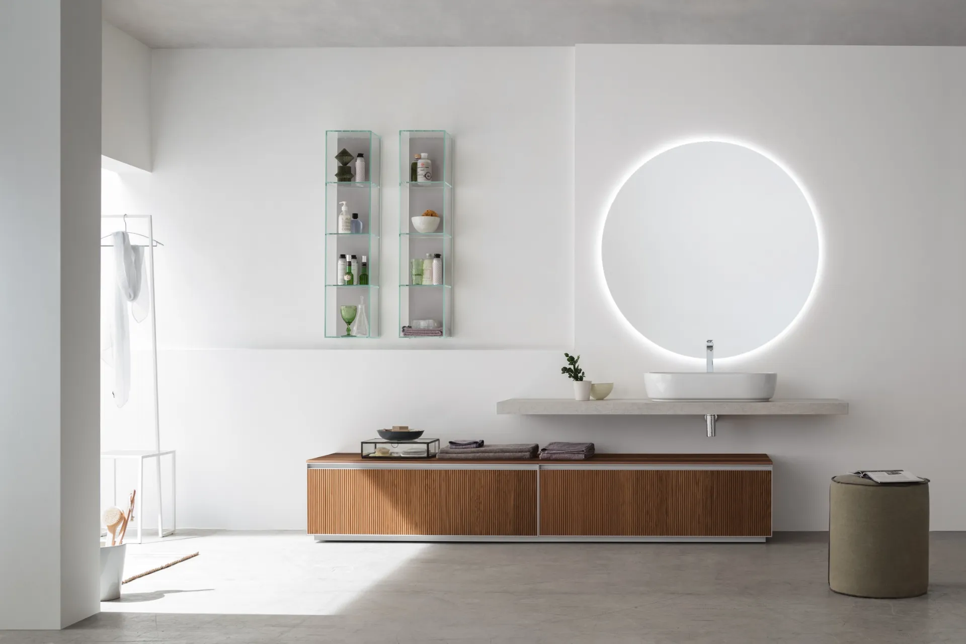 Arreda il bagno di casa design perfettamente con Shape 06, mobili bagno a terra e accessori in legno di Arcom.