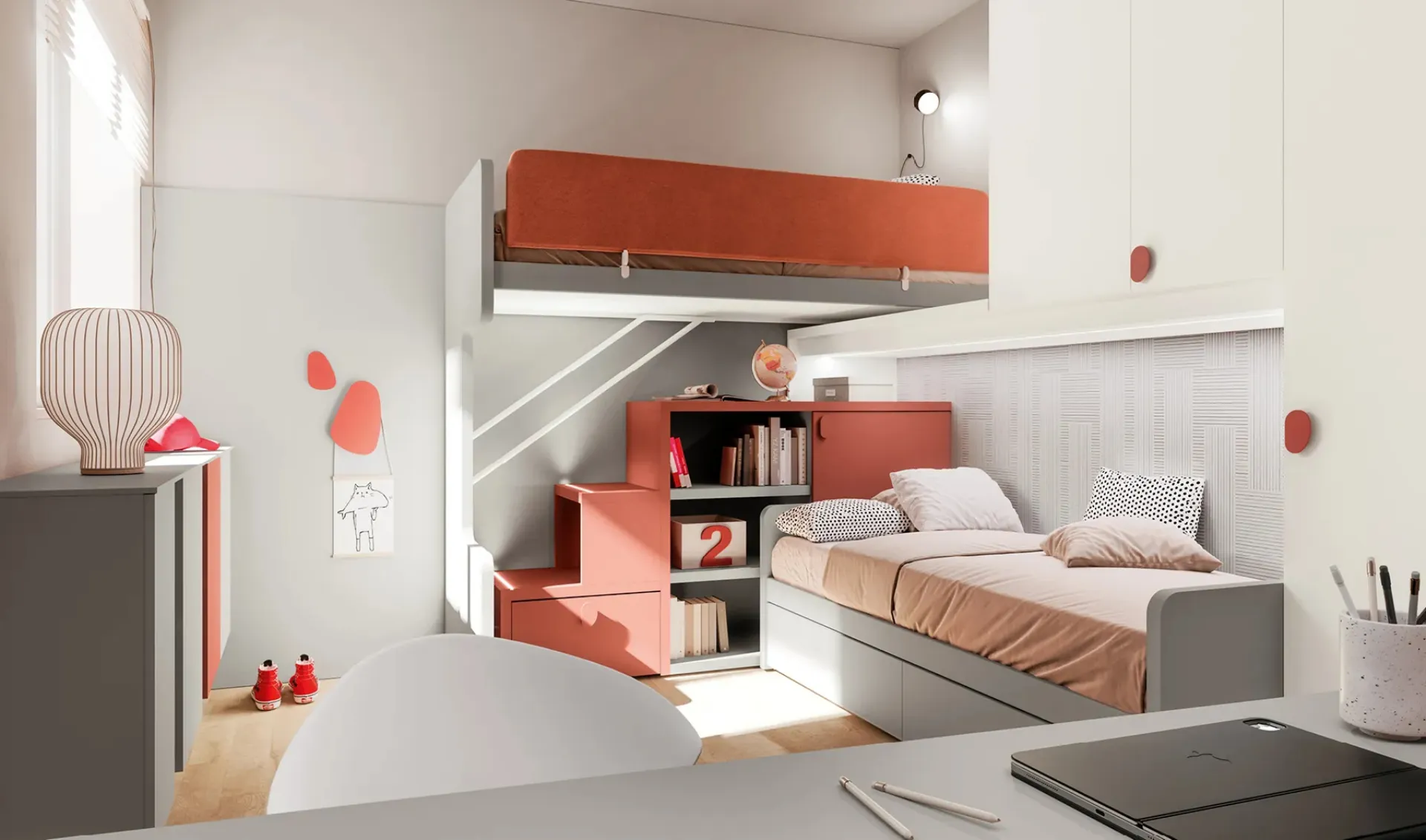 Questa proposta in melaminico ultima alla perfezione le doti pratiche e l'estetica della camaretta, in quanto è capace di congiungere funzionalità ed ergonomia. Nell'arredo della stanza dei piccoli affidati a noi: in negozio presentiamo tutte le più esclusive composizioni moderne per la loro camera. Doimo Cityline offre un ricco catalogo di accessori da accostare su misura: troverai letto, armadio o cabina armadio, scrivania, sedie e librerie. Porta design e colori vivaci nella stanza dedicata ai bambini con questa soluzione, una tra le Camerette a soppalco per bambini di Doimo Cityline. Se cerchi idee creative per organizzare alla perfezione la stanza dei tuoi bambini, ti presentiamo la Cameretta Layout 16B di Doimo Cityline con finitura in melaminico.