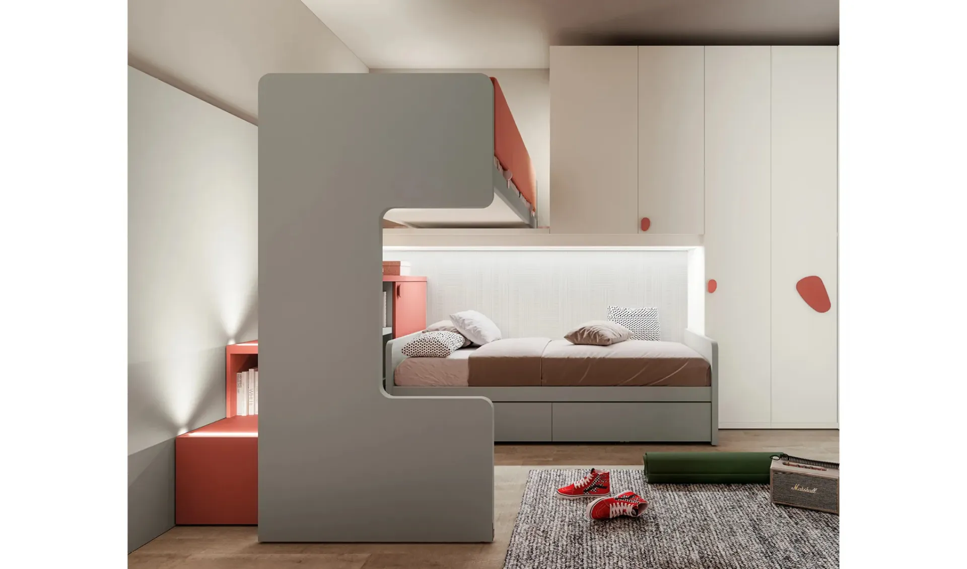 Se cerchi idee creative per organizzare alla perfezione la stanza dei tuoi bambini, ti presentiamo la Cameretta Layout 16B di Doimo Cityline con finitura in melaminico.
