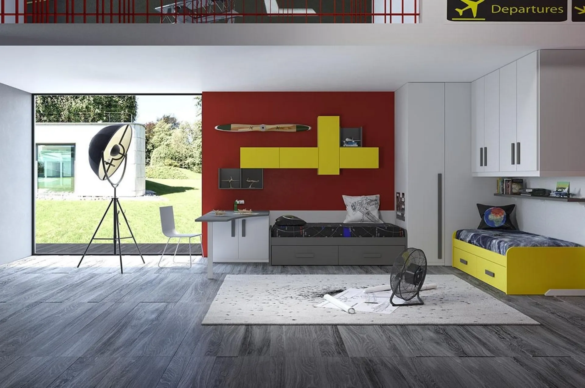 Arreda stanzette moderne con le Camerette a ponte Imamobili! Il modello Cameretta Francesco in melaminico è per ragazzi.