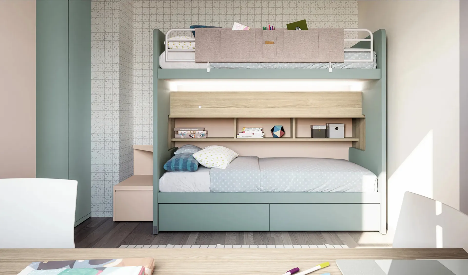Se cerchi spunti progettuali per progettare alla perfezione la stanza dei tuoi figli, ti proponiamo la Cameretta Layout 13B di Doimo Cityline con finitura in melaminico.