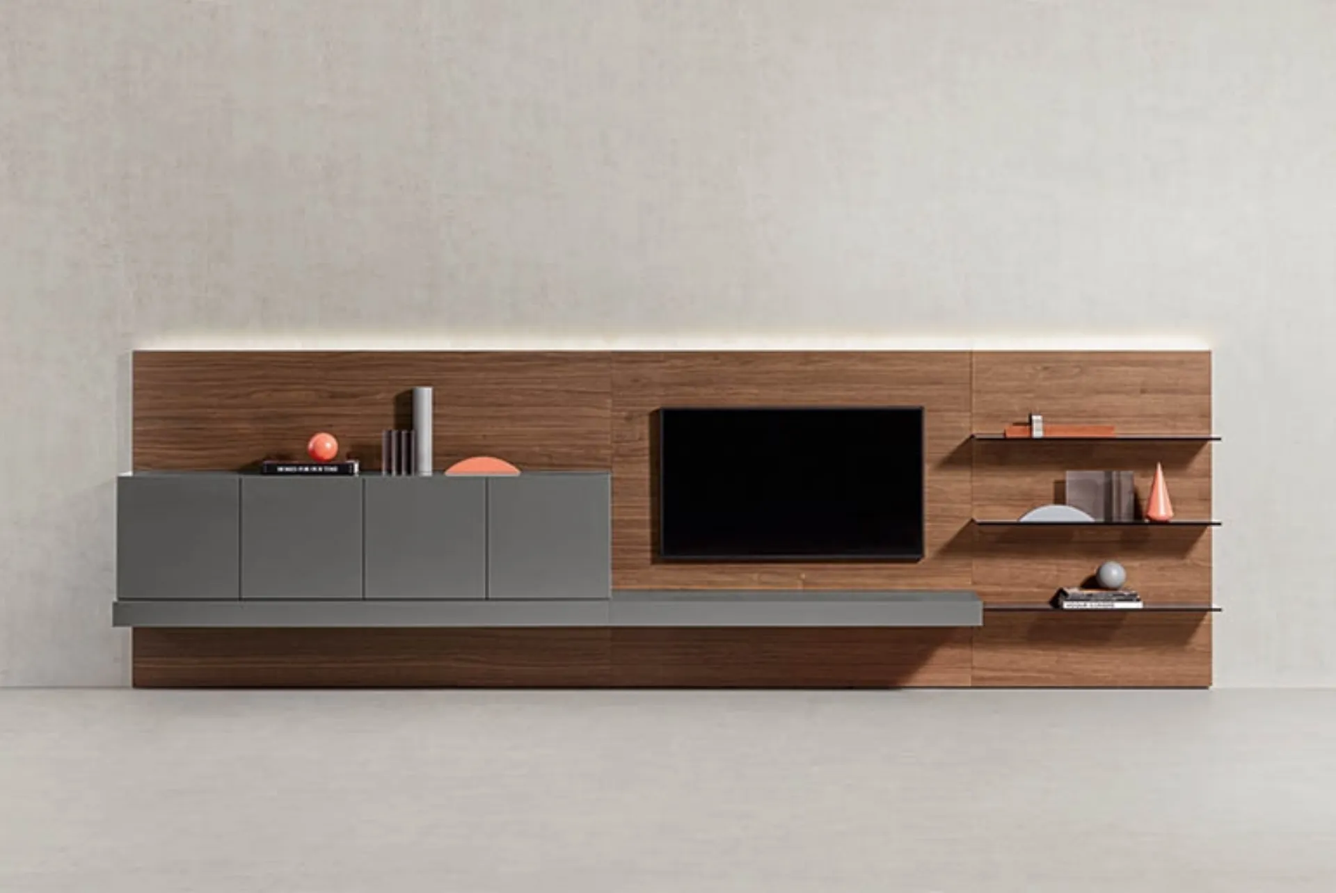 Se desideri ultimare un soggiorno operativo e pratico dalle linee moderne, ecco a te la parete attrezzata People laccato Cenere Pianca.