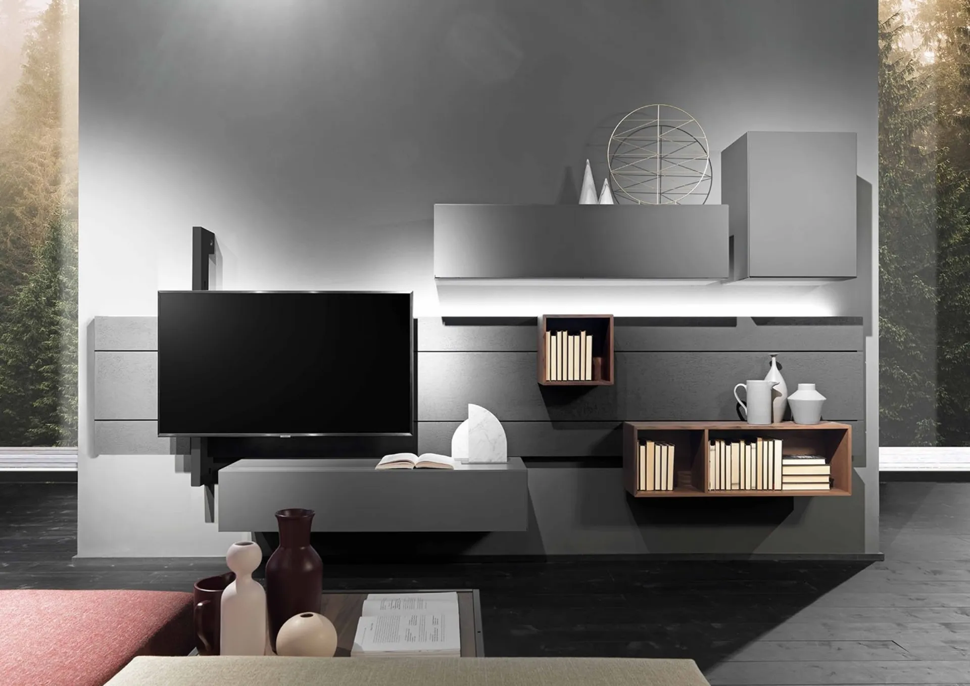Vuoi progettare un living dinamico e operativo? Ecco a te la parete attrezzata Sorvolo D 01 Fimar dalle forme decise moderne.