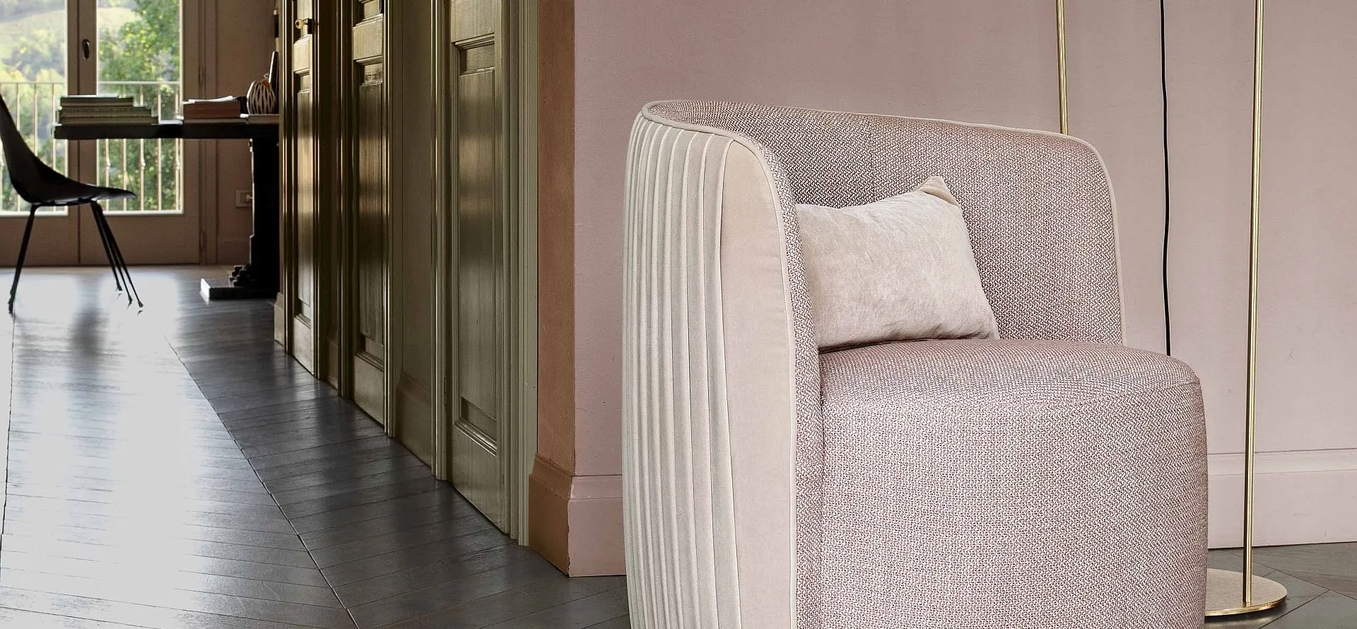 Se vuoi una poltroncina per stanze moderne, clicca e leggi di più sul modello Chloe Luxury in tessuto del brand Ditre Italia.