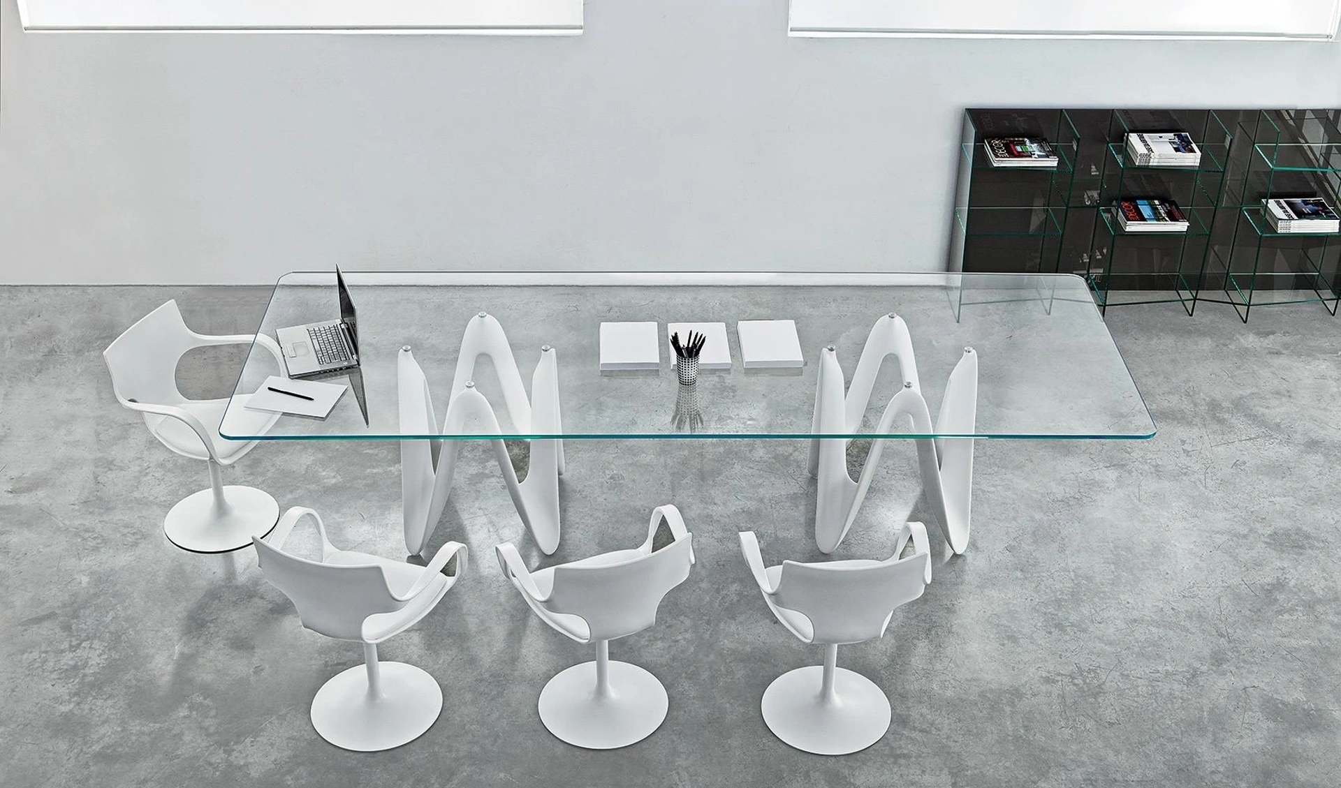 Se cerchi tavoli fissi design, ecco a te il modello da pranzo in vetro Lambda con doppia base della marca Sovet.
