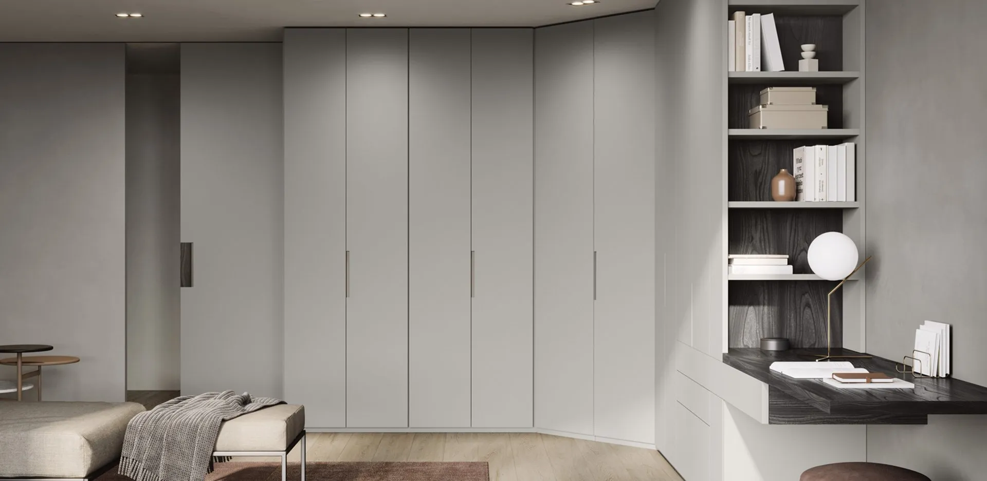 Ti presentiamo l'armadio Trattino in laccato opaco di Fimar! Un ricco catalogo di armadi ad angolo con ante battenti.