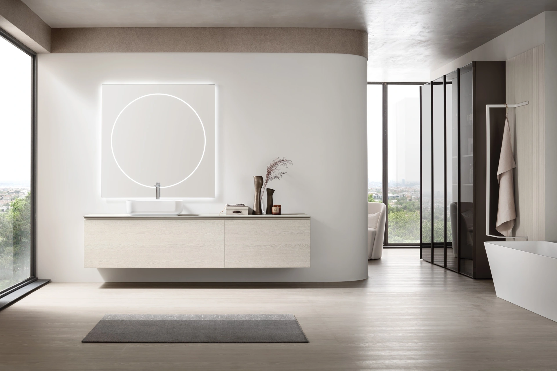 mobili bagno sospesi in legno del marchio Arcom: clicca e scopri l'arredo bagno moderno Soul 21 per la stanza del benessere.