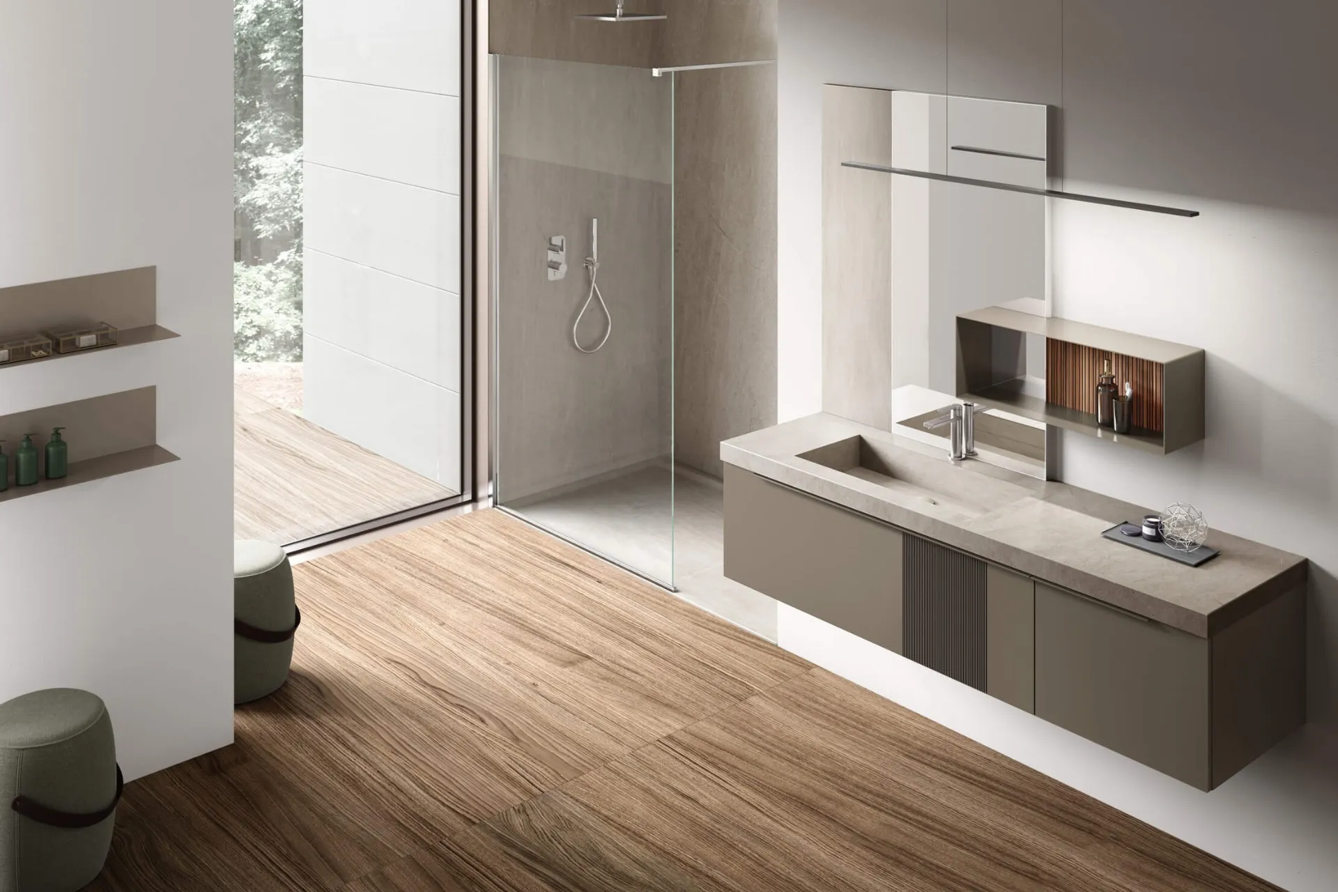 Mobili bagno sospesi Pollock Trame 094 di Arcom: scopri l'Arredo Bagno in laccato opaco design e arreda la stanza del benessere.
