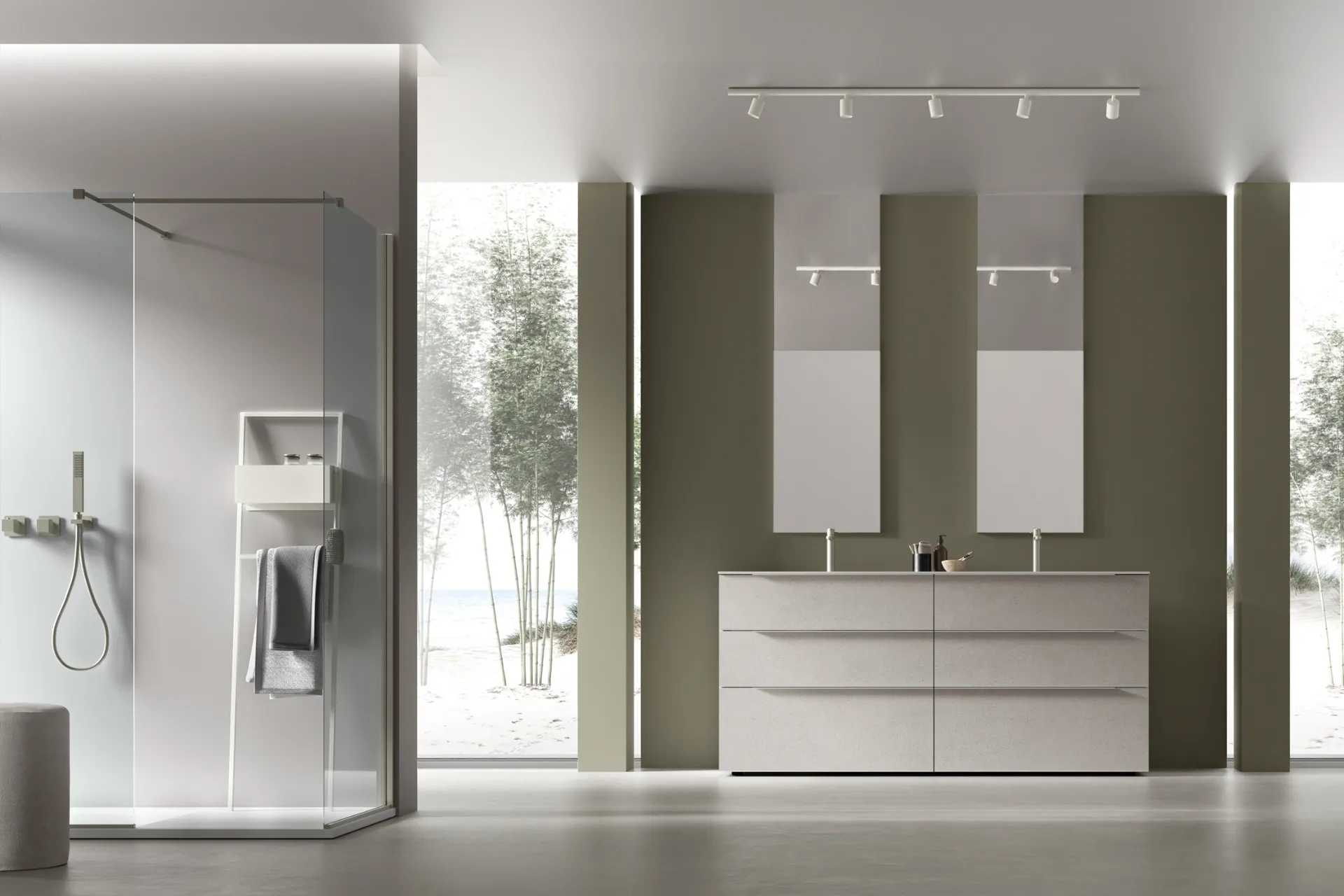 Ottieni informazioni sull'arredo bagno moderno: mobili bagno a terra in melaminico come il modello Rail 02 di Arcom ti attendono.
