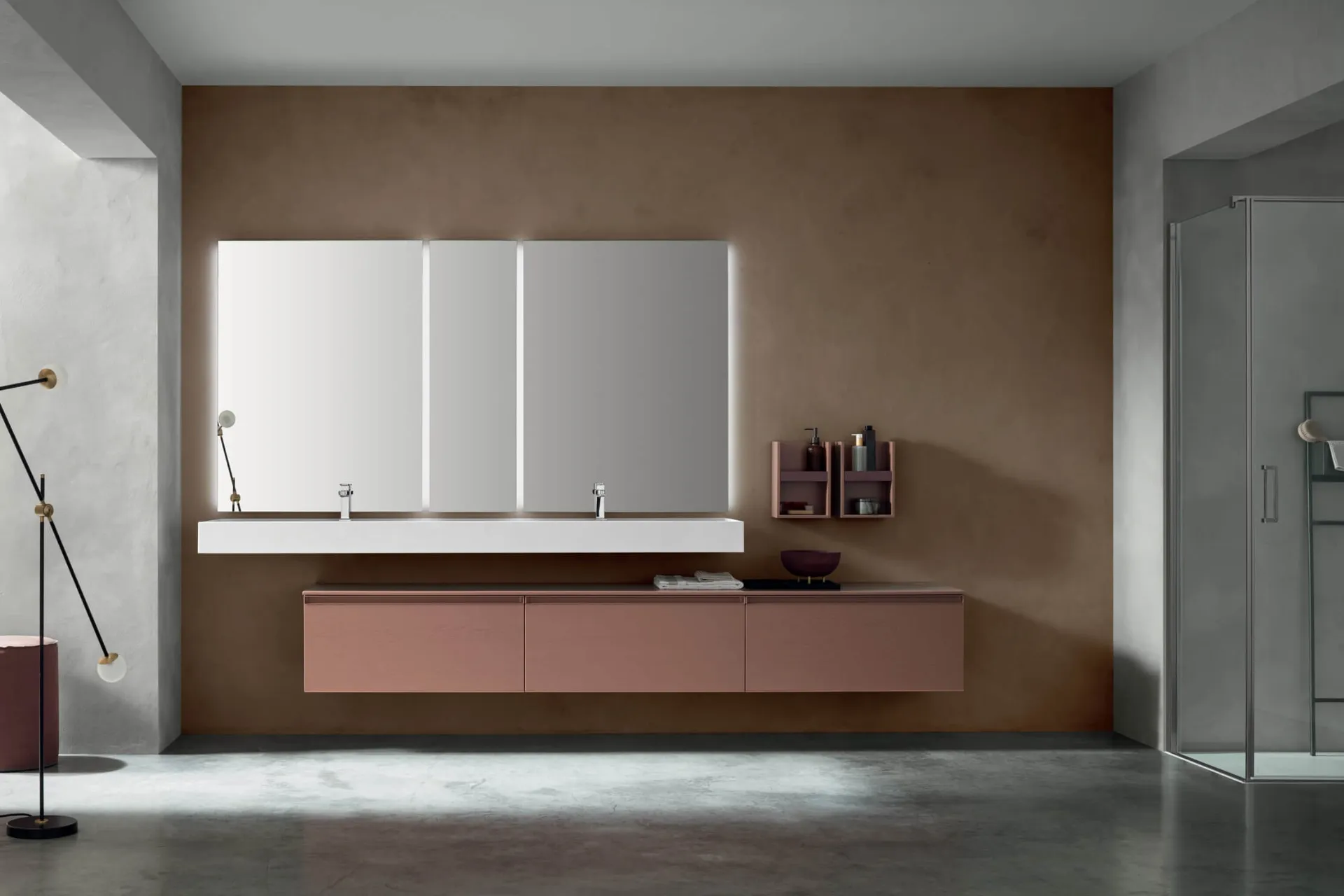Mobili bagno sospesi in laccato opaco dell'azienda Arcom: clicca e scopri l'arredo bagno moderno Rail Gola 14 per la stanza del benessere.