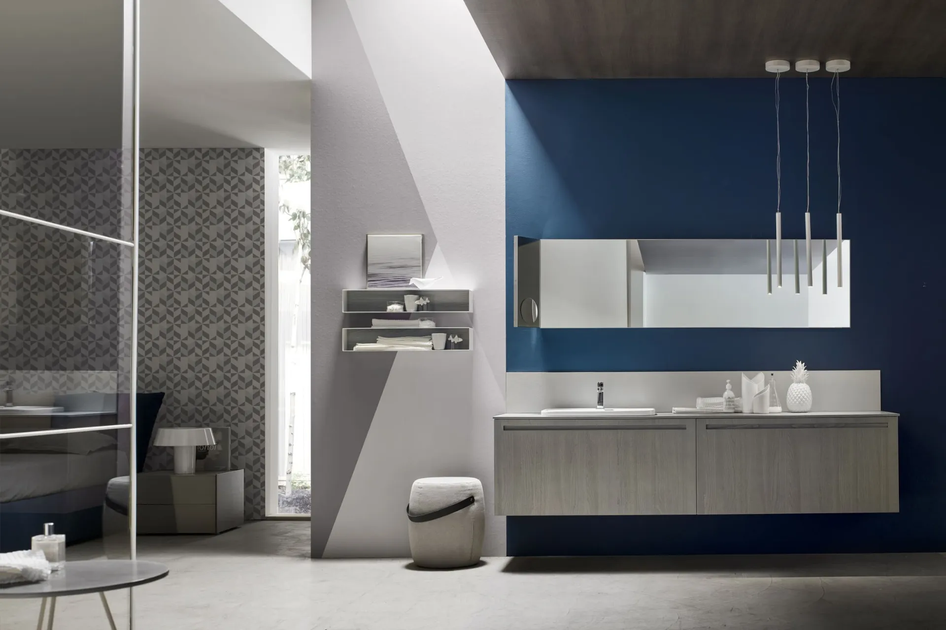 Arreda la stanza del benessere moderno alla perfezione con Rush 22, mobili bagno sospesi e oggetti in legno di Arcom.