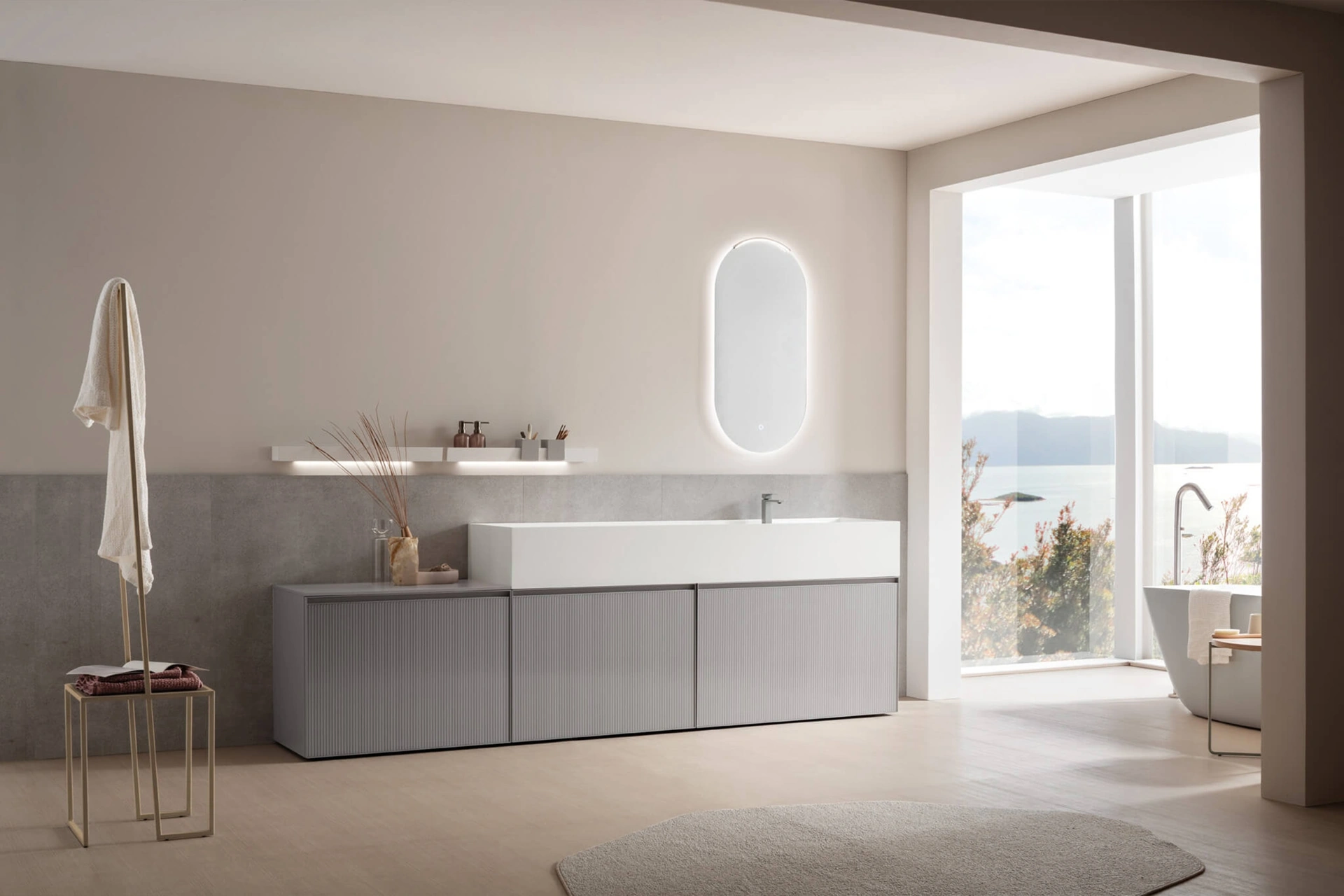 Arreda il tuo bagno moderno perfettamente con Shape 31, mobili bagno a terra e oggetti in vetro di Arcom.