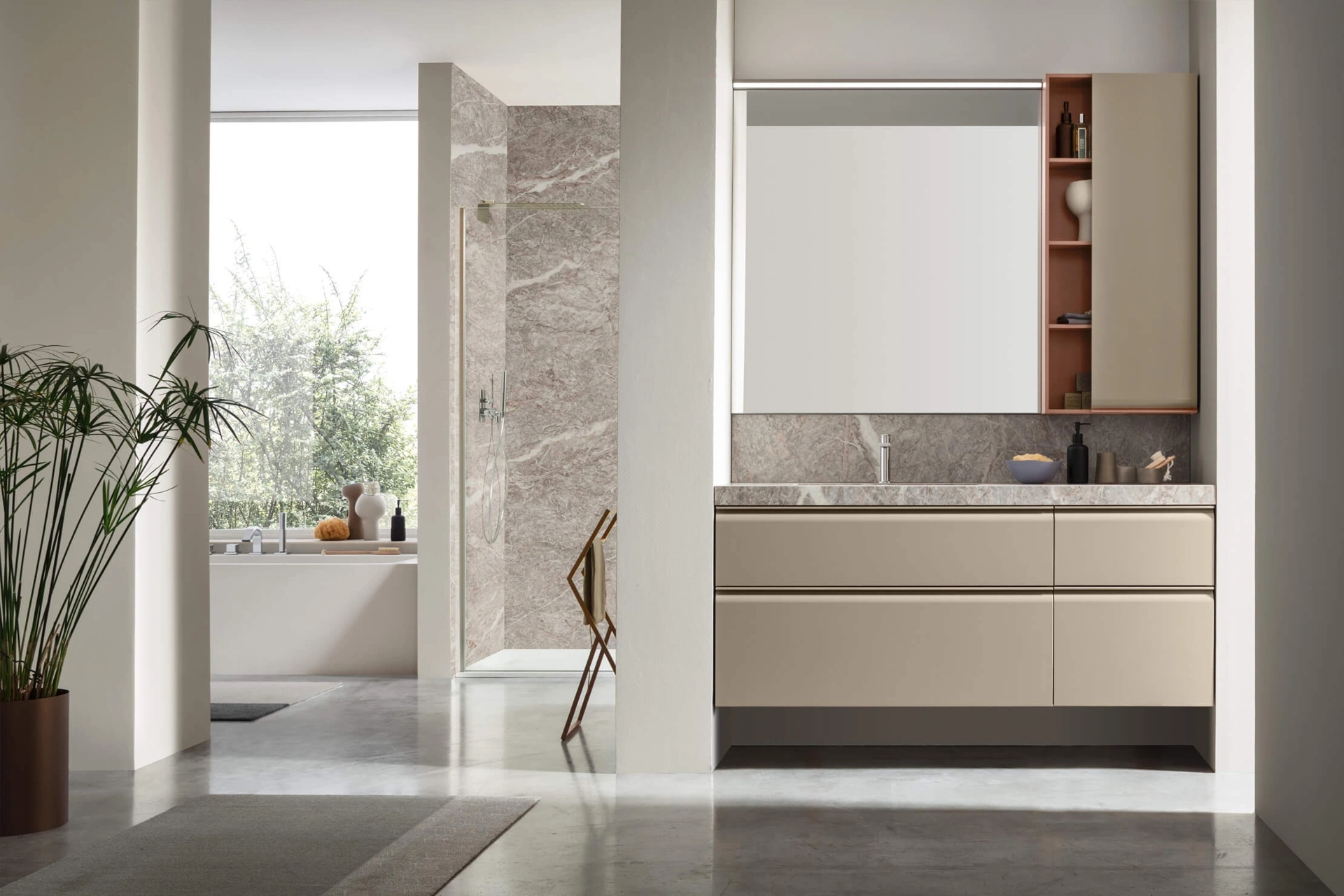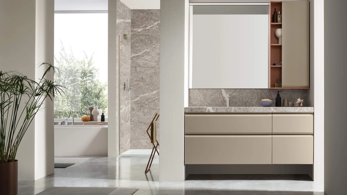 mobili bagno sospesi in laccato opaco della firma Arcom: clicca e scopri l'arredo bagno moderno Virgola 02 per la stanza del benessere.