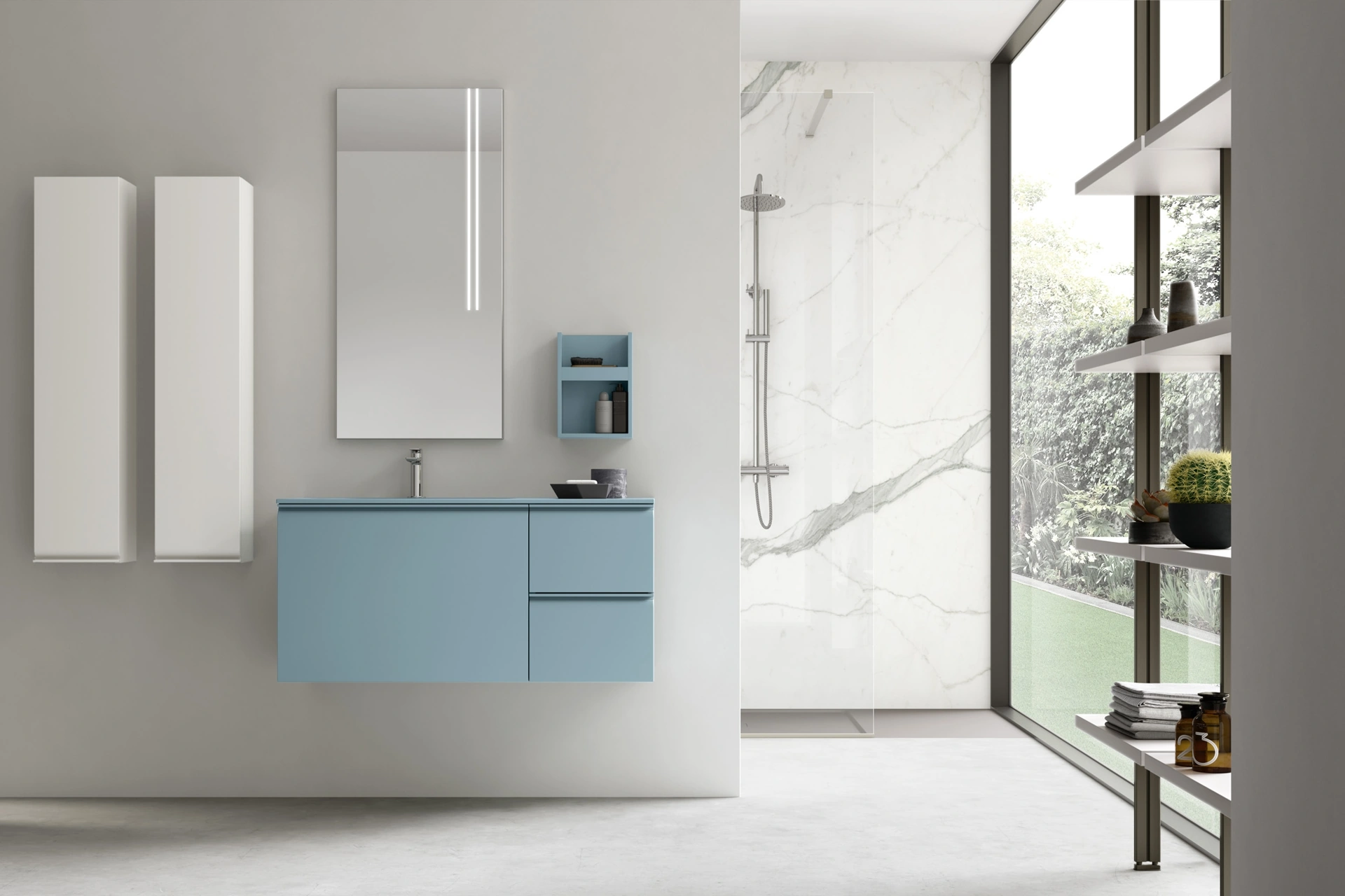 Arreda la stanza del benessere moderno alla perfezione con Virgola 06, mobili bagno sospesi e oggetti in laccato opaco di Arcom.