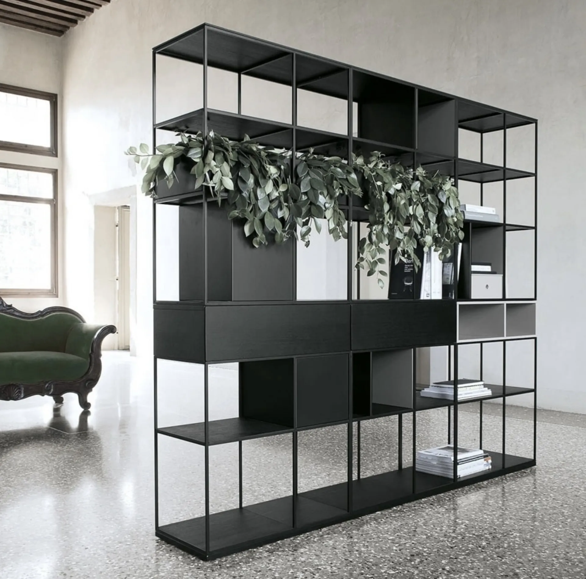 Vuoi rinnovare il soggiorno? Scopri di più sulle librerie moderne divisorie e arreda i tuoi locali con il modello Atelier configurazione 02.